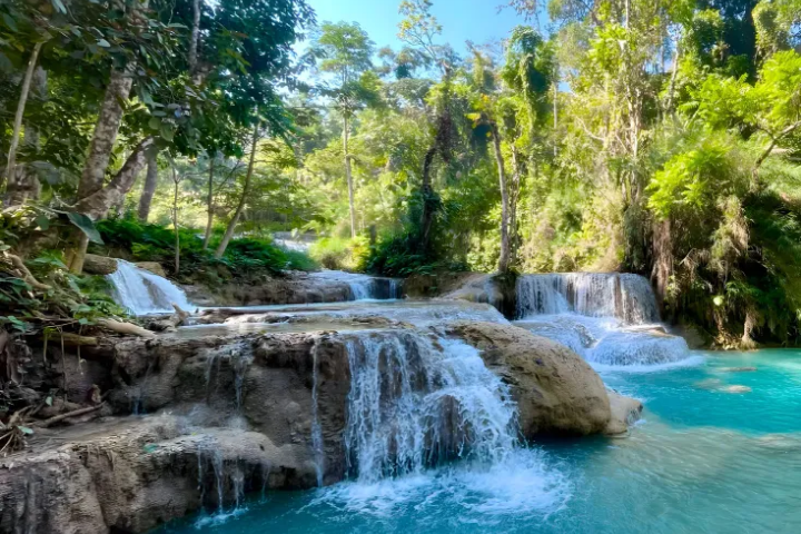 라오스 루앙프라방에서 약 30km 떨어진 곳에 위치한 **꽝시 폭포**는 라오스에서 가장 아름다운 폭포로 손꼽히는 자연 명소다. 에메랄드빛 물이 계단식으로 이어진 웅덩이를 따라 흘러내리며 장관을 이루고, 울창한 숲과 어우러져 이국적인 풍경을 만들어 낸다. 루앙프라방 여행 시 많은 사람들이 찾는 대표적인 관광지다.